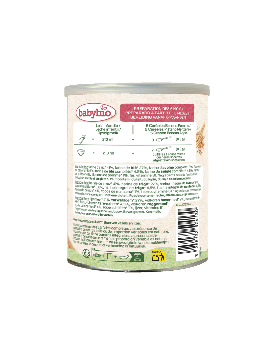 Harina de arroz* 41%, harina de trigo* 27%, harina de avena integral* 9%, copos de plátano* 8,6%, harina de trigo integral* 4,5%, harina de centeno integral* 4,5%, harina de quinoa* 4%, copos de manzana* 1%, hierro, vitamina B1.