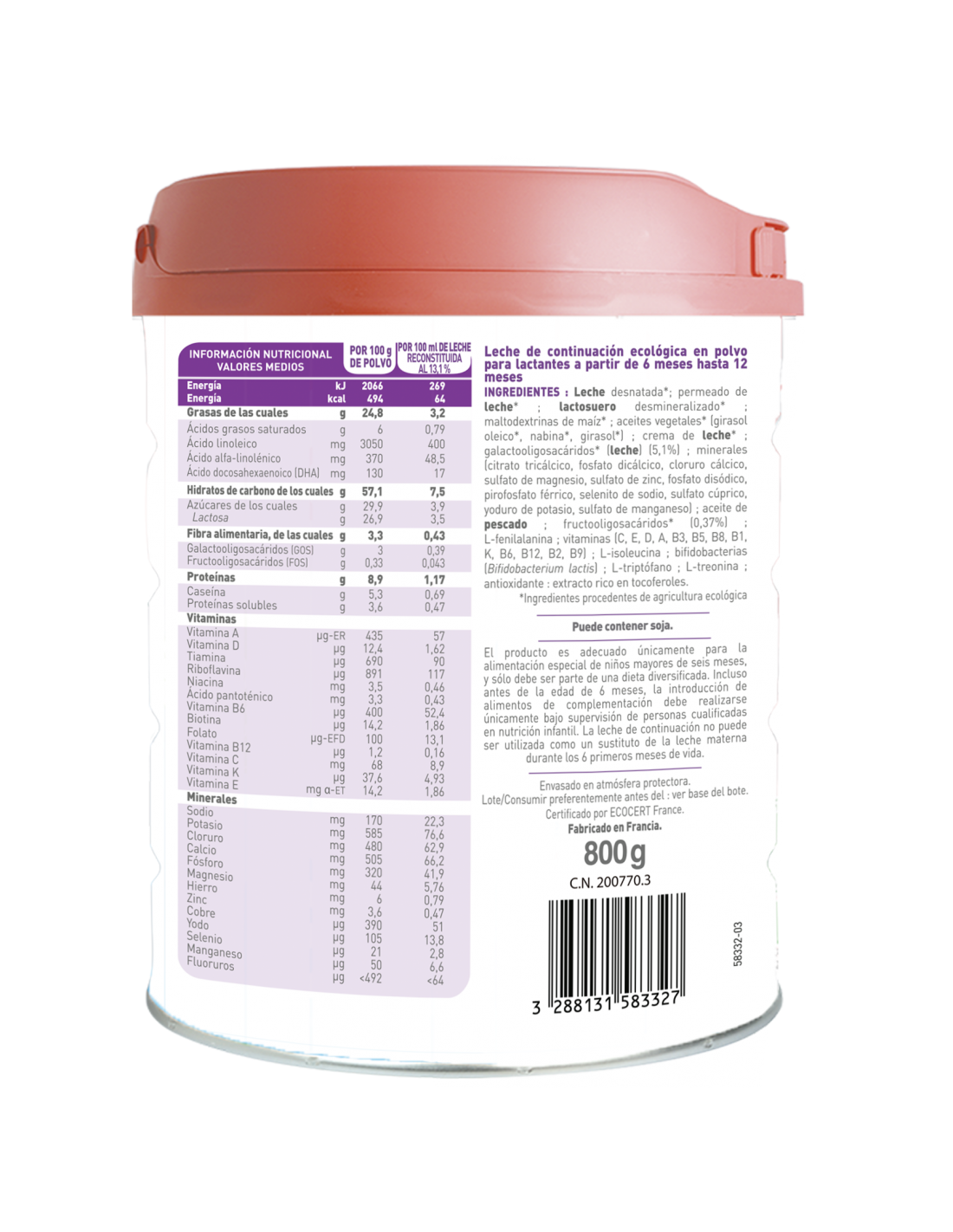 Todas las etapas están controladas en particular por un organismo de certificación independiente que garantiza el cumplimiento de las normas de producción ecológica. Además, todos los componentes de las fórmulas Babybio son el resultado de una cuidadosa selección y todo ello respetando la normativa infantil.
