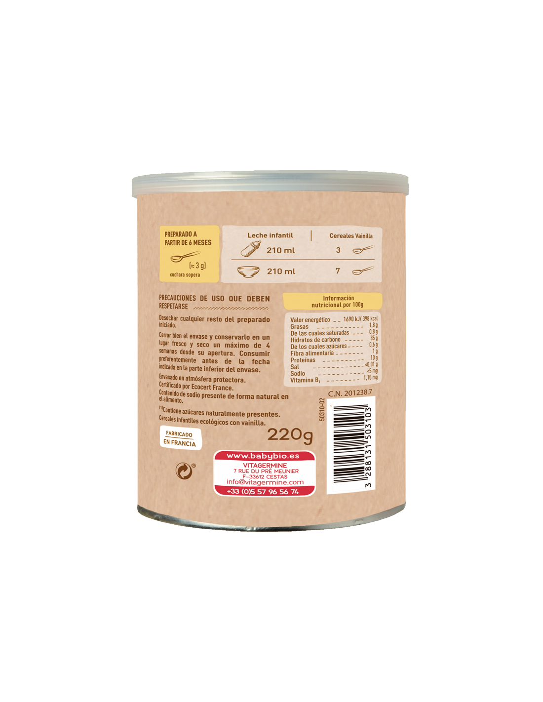 - Cereales infantiles ecológicos con vainilla. Fabricado en Francia.