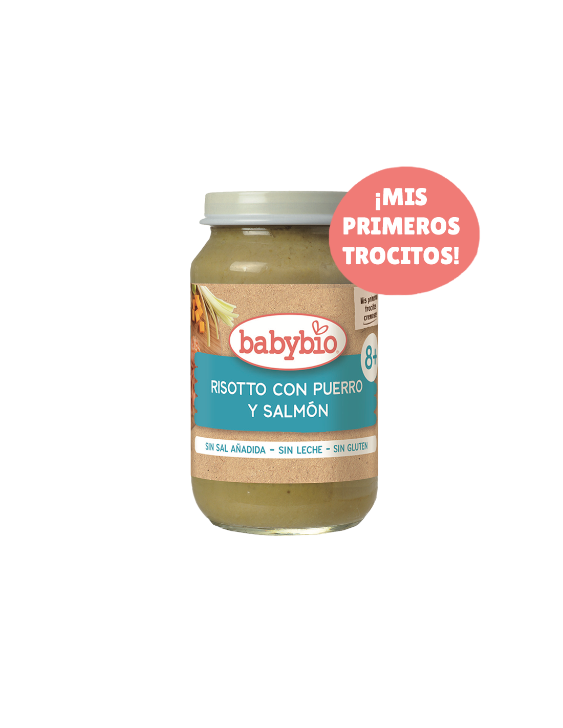 Textura con Trocitos para la Exploración: Nuestro Tarrito con Trocitos de Risotto de Puerros y Salmón presenta una textura suave pero con pequeños trozos que permiten a tu bebé explorar diferentes sensaciones al comer. Es el paso perfecto hacia alimentos más sólidos y variados, mientras se mantiene la seguridad y facilidad de consumo para los más pequeños.