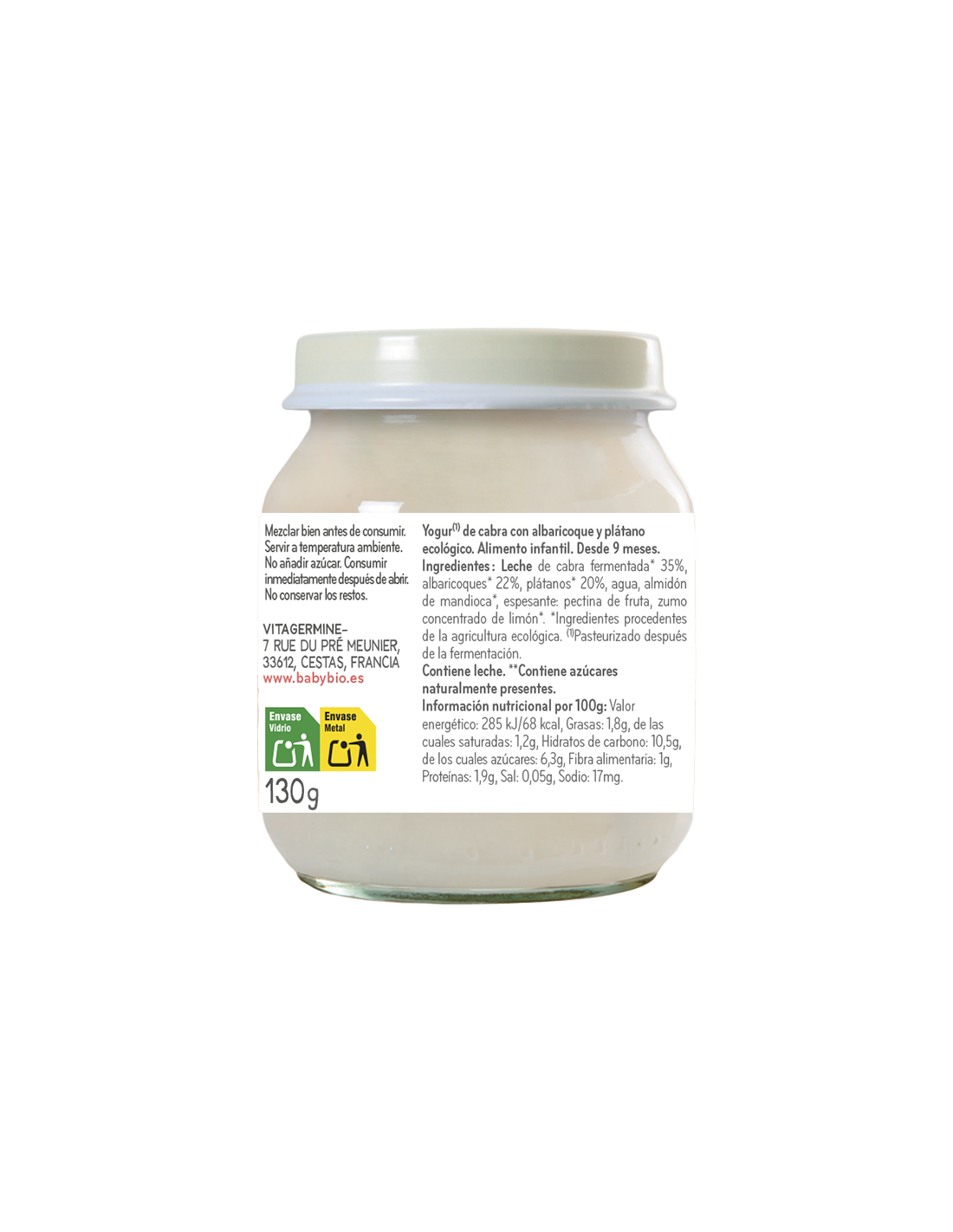 Leche de cabra fermentada* 40%, albaricoques* 27%, plátanos* 18,5%, agua, almidón de mandioca*, espesante: pectina de frutas,