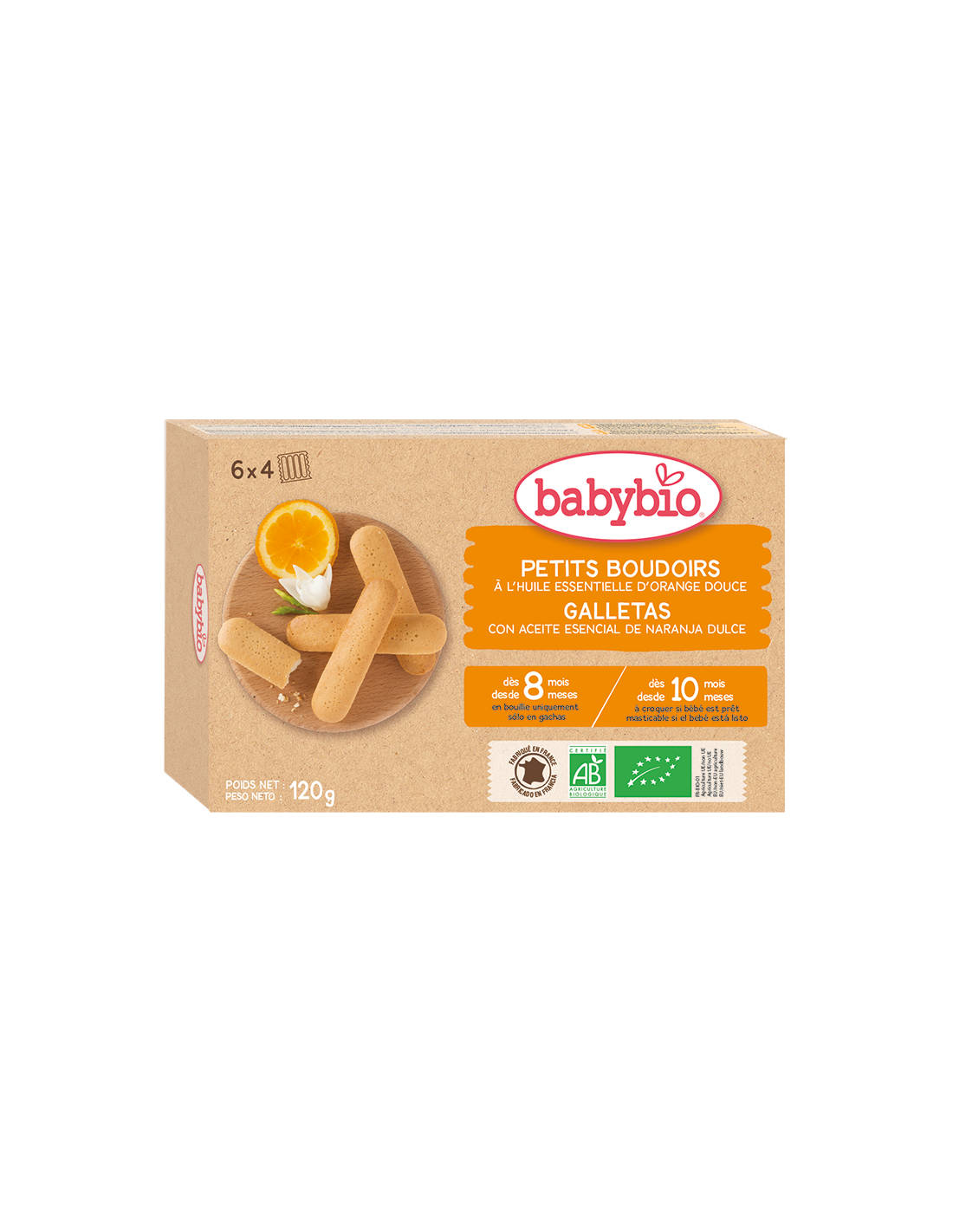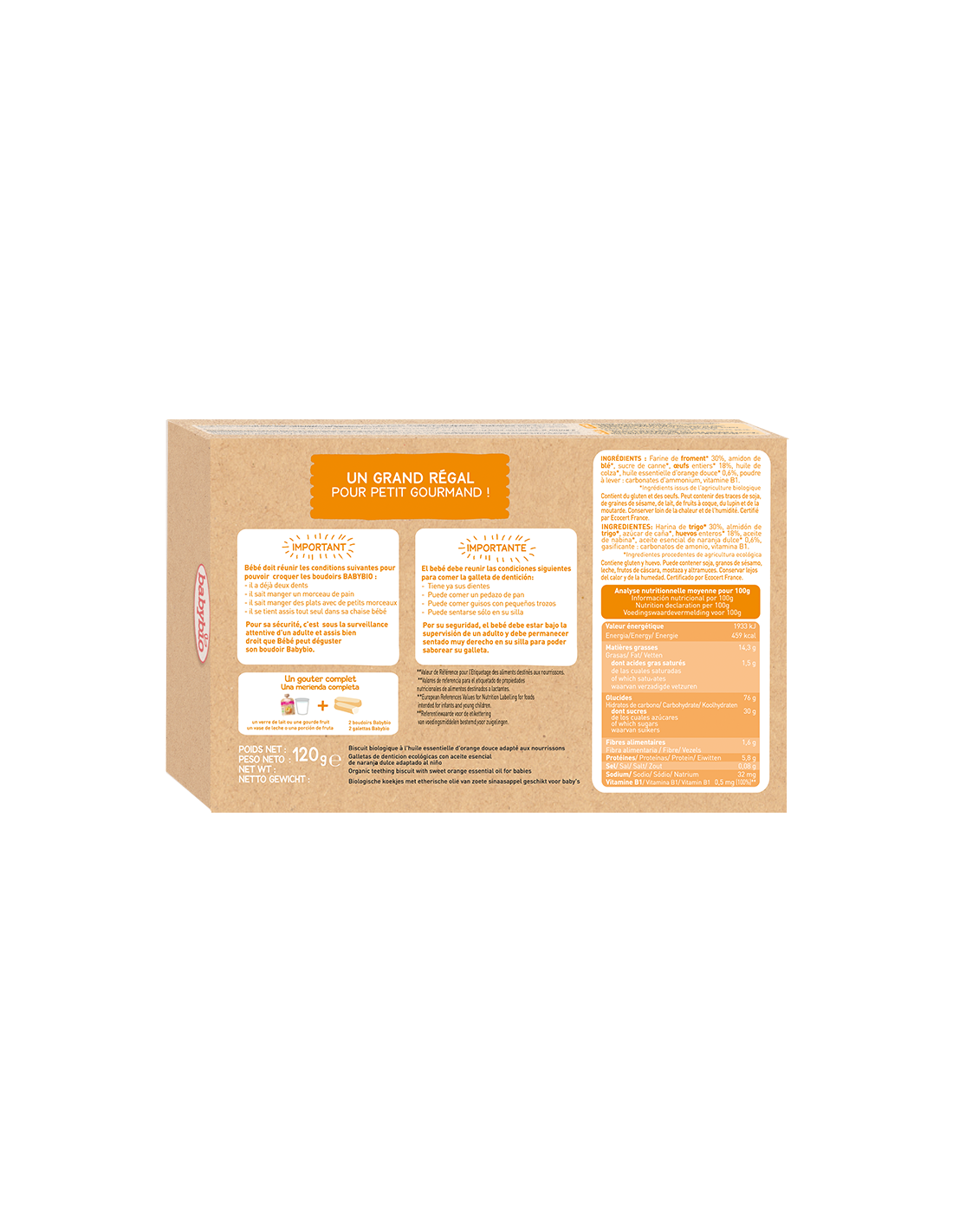 Os biscoitos para a dentição com um delicioso sabor a laranja são feitos com ingredientes 100% biológicos e fornecem ao seu bebé uma grande quantidade de vitaminas e minerais. O seu formato e textura foram especialmente desenvolvidos para a boca e mãos dos bebés. A sua textura especial foi desenvolvida para estimular o início da mastigação e o seu formato anatómico é adequado para o bebé segurar com facilidade.