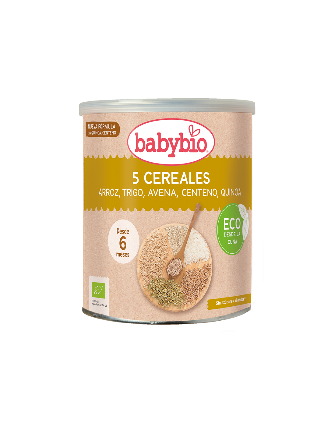 Os papas de 5 grãos da Babybio: ARROZ, TRIGO, AVEIA, CENTEIO E QUINOA, são feitos com cereais 100% biológicos.