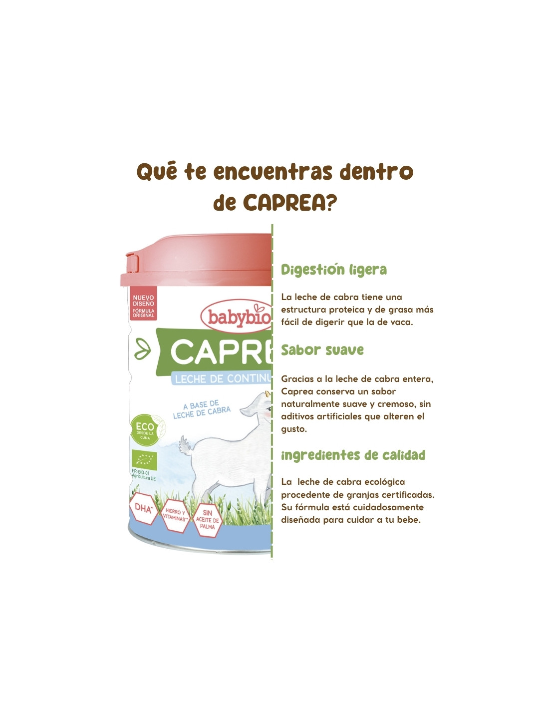 A fórmula CAPREA 2 da Babybio é suave para o estômago graças à sua composição proteica (semelhante ao perfil do leite materno). Fornece vitaminas, minerais e nutrientes essenciais para complementar a dieta variada e equilibrada do seu bebé. Contém também DHA para ajudar os bebés a desenvolver uma visão normal.