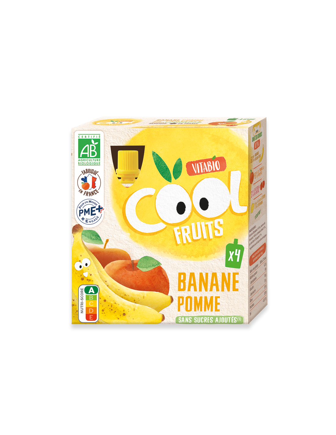 Puré de banana, maçã e sumo concentrado de limão biológico.