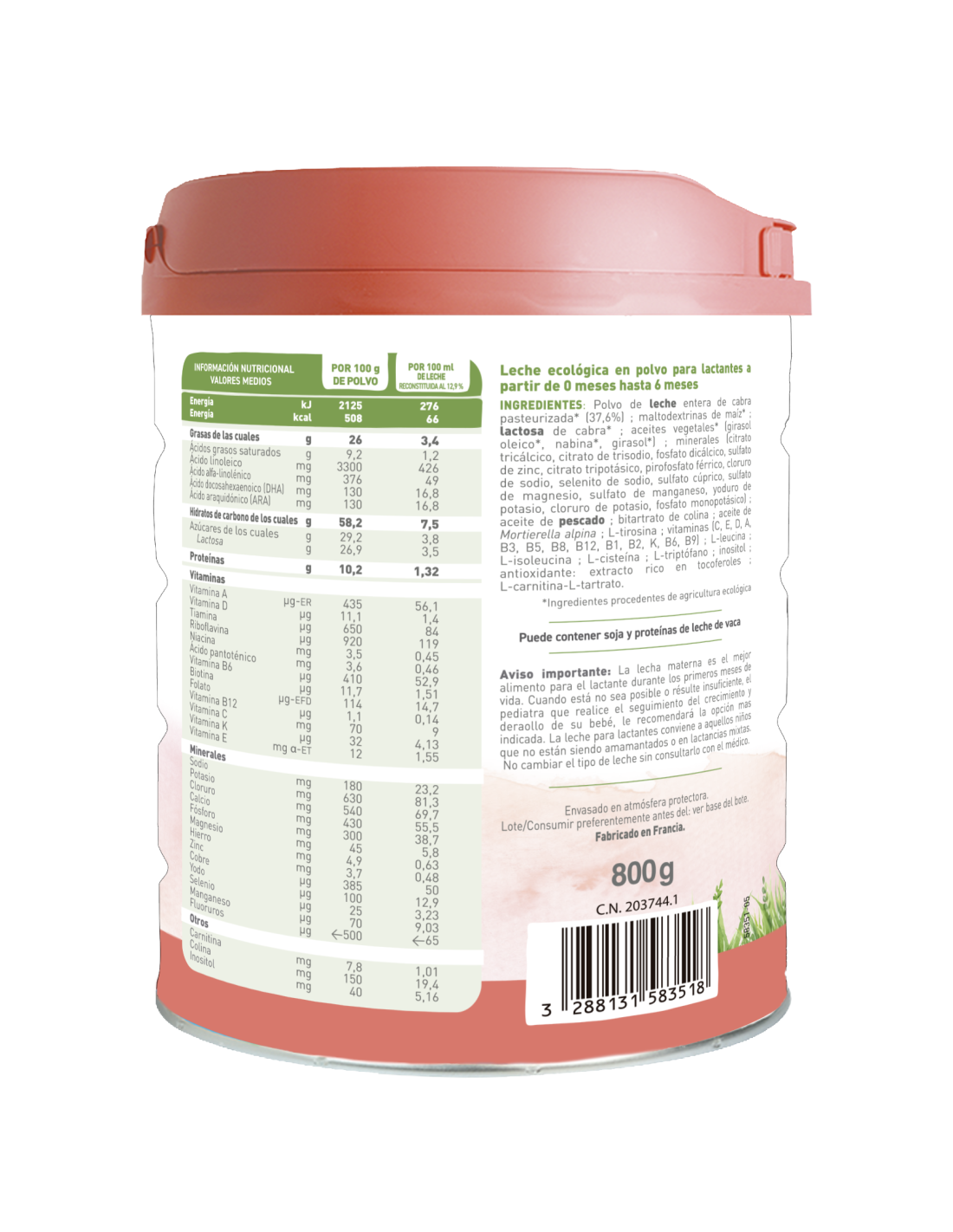 Leite de cabra em pó gordo da Holanda (37,6%); maltodextrinas de milho; lactose de cabra*; óleos vegetais* (girassol alto oleico*, colza*, girassol*); minerais (citrato de cálcio, citrato de sódio, fosfato de cálcio, sulfato de zinco, citrato de potássio, pirofosfato de ferro, cloreto de sódio, selenito de sódio, sulfato de cobre, sulfato de magnésio, sulfato de manganês, iodeto de potássio, cloreto de potássio, fosfato de potássio); óleo de peixe; bitartarato de colina; Óleo de Mortierella alpina; L-tirosina; vitaminas (C, E, D, A, B3, B5, B8, B12, B1, B2, K, B6, B9); L-leucina; L-isoleucina; L-cisteína; L-triptofano; inositol; antioxidante: extrato rico em tocoferóis; L-carnitina-L-tartarato.**