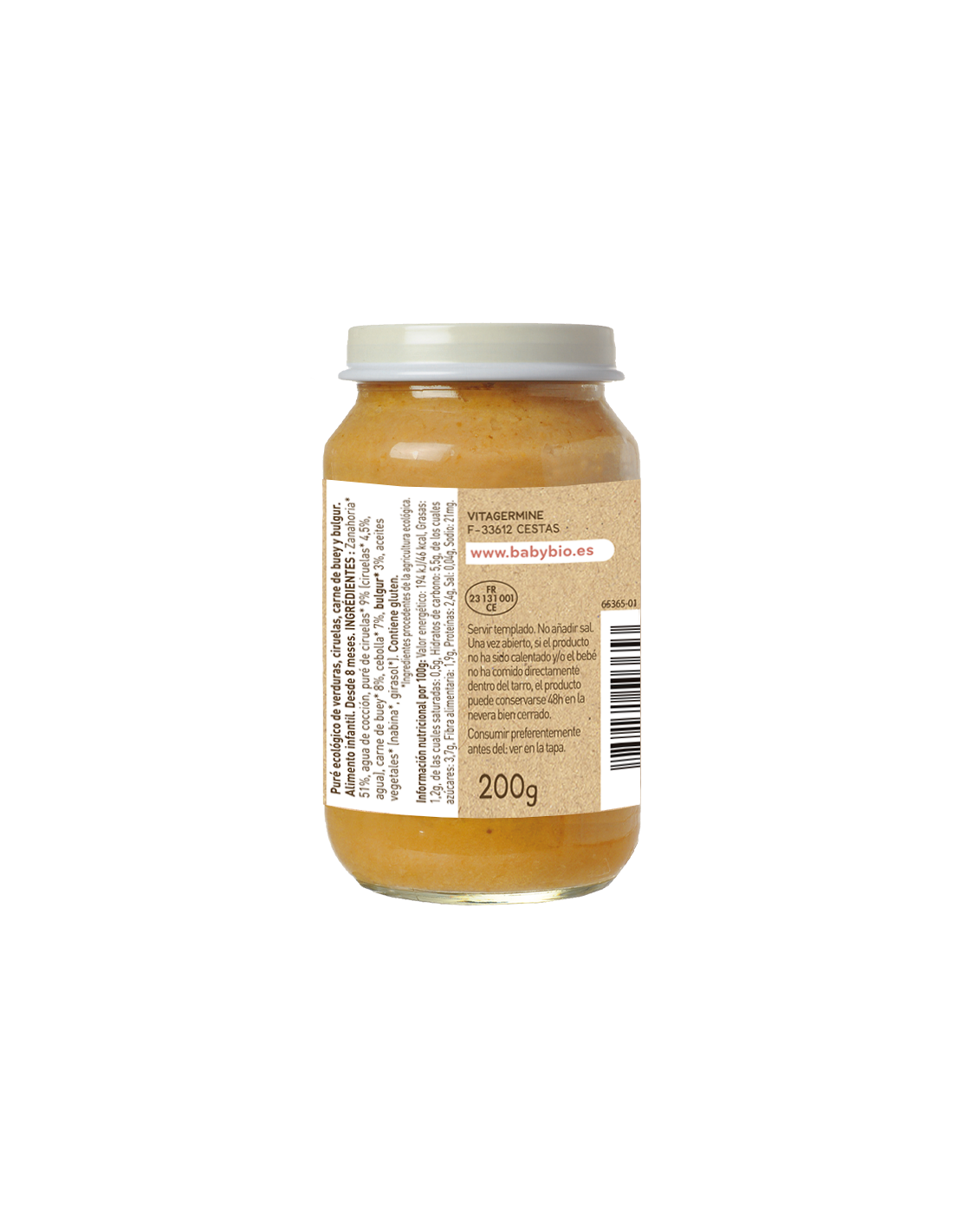 Cenoura* 51%, água de cozedura, puré de ameixa* 9% (ameixas* 4,5%, água), carne de vaca* 8%, cebola* 7%, bulgur* 3%, óleos vegetais* (colza*, girassol*).