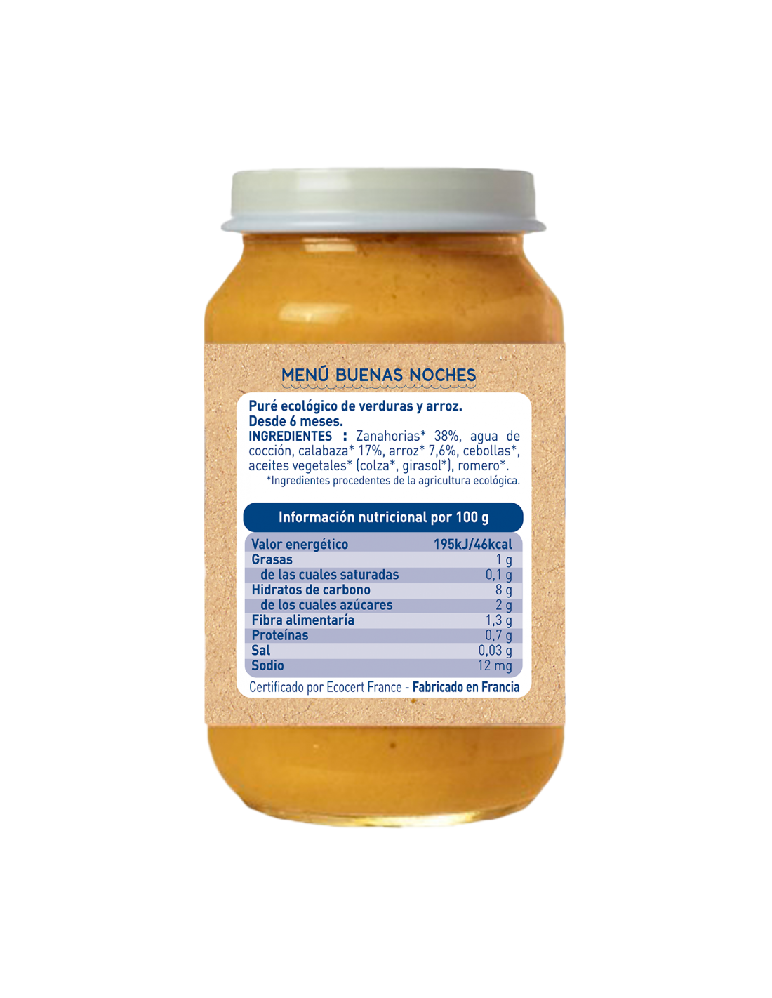 O Menu Boa Noite com Cenoura, Abóbora e Arroz é elaborado com ingredientes biológicos, vegetais e grãos selecionados para oferecer ao seu bebé a melhor qualidade.