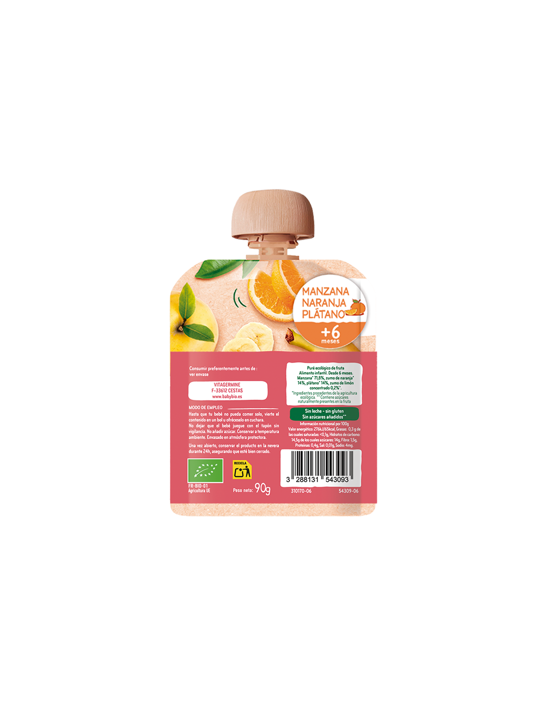 Maçãs da nossa região* 71,8%, sumo de laranja de Espanha* 14%, banana do Equador* 14%, sumo de limão concentrado de Espanha* 0,2%.